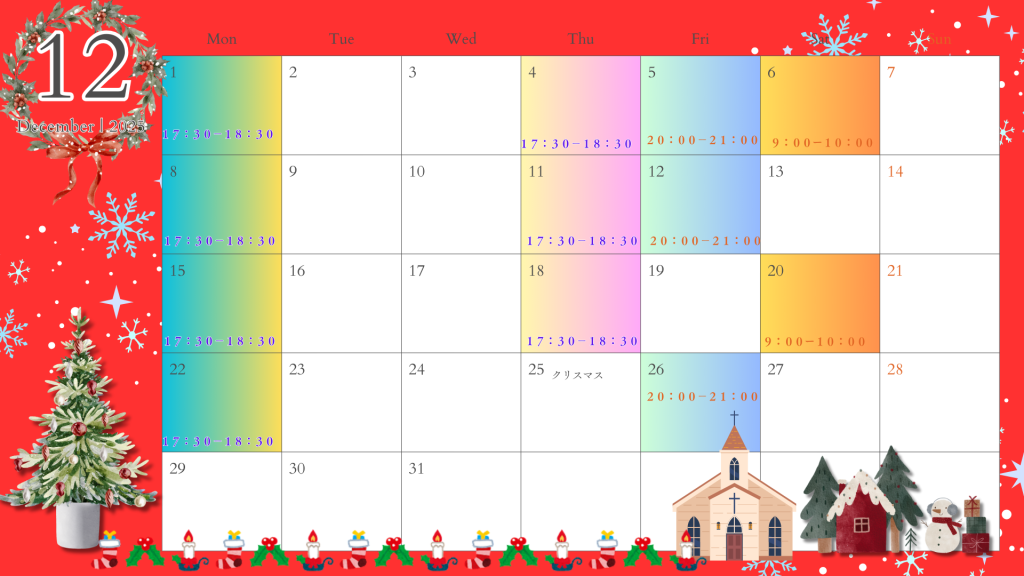冬休みやクリスマスのご予定も入りやすい時期かと思いますので、無理のない範囲でスケジュール調整していただければ幸いです。