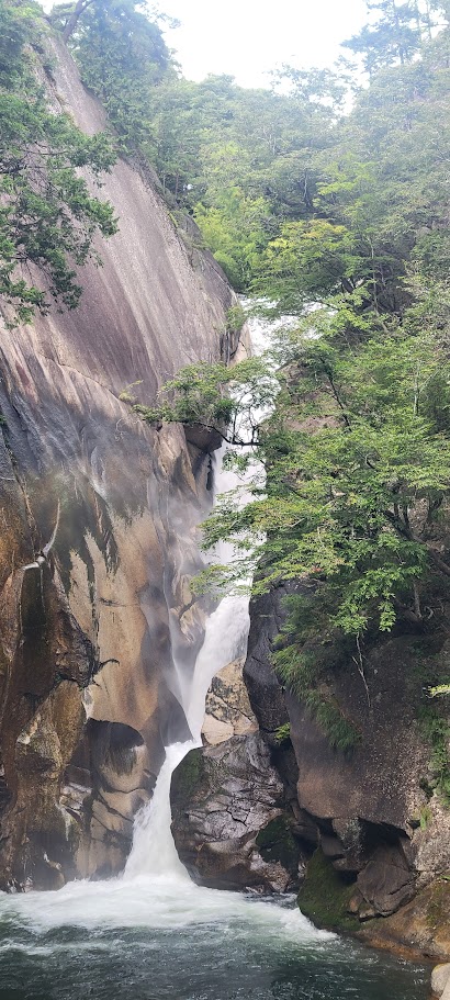 昇仙峡では、岩肌を流れ落ちる滝の迫力に感動。